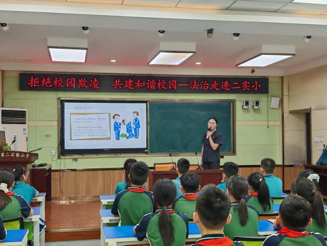 为筑牢校园安全防线,营造和谐友爱的成长环境,9月4日,内黄县人民法院法官助理平晓月,以法治副校长的身份走进内黄县第二实验小学,开展以“拒绝校园欺凌,共建和谐校园”为主题,通过“观看宣传片+以案释法+情景互动”的创新形式,为100余名师生送上了一堂生动的法治教育课。